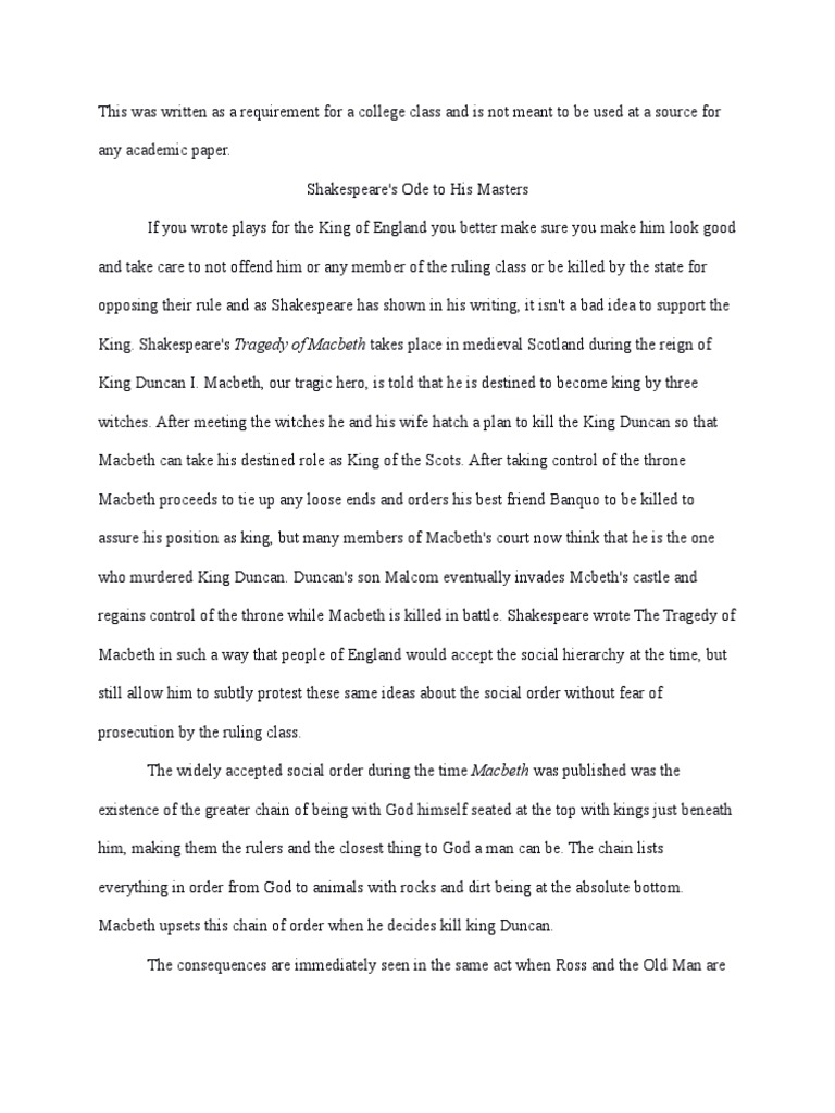 Meanwhile, Macbeth and another nobleman, Banquo, meet three witches that give Macbeth three predictions: That he will become the thane of Glamis, the thane of Cawdor, and then shall become king. Since Macbeth already had the title of thane of Glamis passed down to him from his father, and Ross tells him that he is the new thane of Cawdor, Macbeth believes that all of the prophecies critical analysis of macbeth coming true. When Macbeth informs his wife, Lady Macbeth, of this, she wishes to become queen so much, that she presses Macbeth to plot and murder King Duncan while he sleeps in their castle.